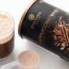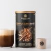 Whey protein hidrolisado e isolado, com colágeno hidrolisado em peptídeos, café (com 75mg de cafeína), cacau e extrato natural de canela.